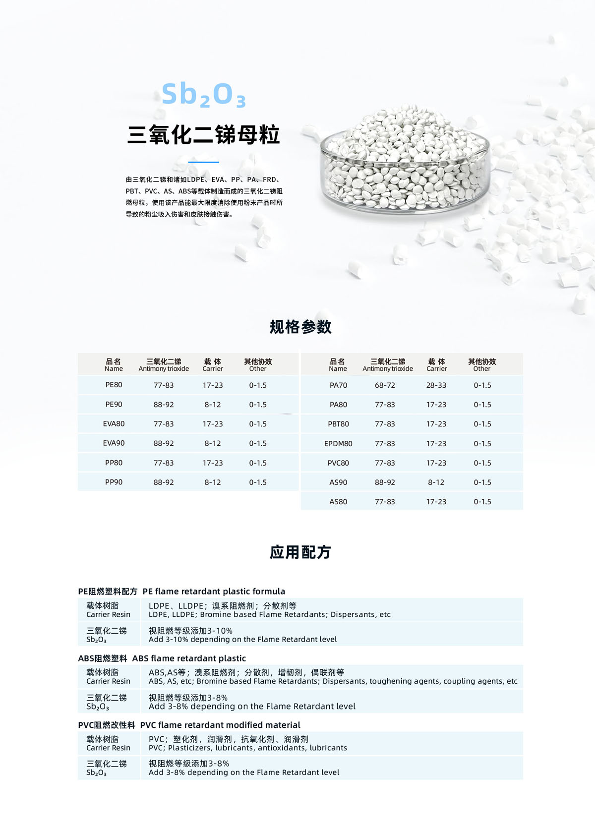 廣泛用于PVC、PP、PE、ABS、PBT、PS、PA、AS等塑料的溴系阻燃協(xié)效劑,其與鹵素化合物(如溴、氯)等配合使用可提高阻燃效果,對基材的力學性能影響小,添加少量即可達到UL94 V-0級阻燃標準。