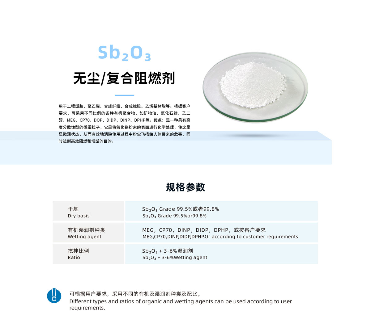 一種具有高度分散性型的微細粒子,它是將氧化銻粉末的表面、進行化學處理,使之呈顯微潤狀態(tài),從而有效地消除使用過程中粉塵飛揚給人體帶來的危害,同時達到高效阻燃和增塑的目的。